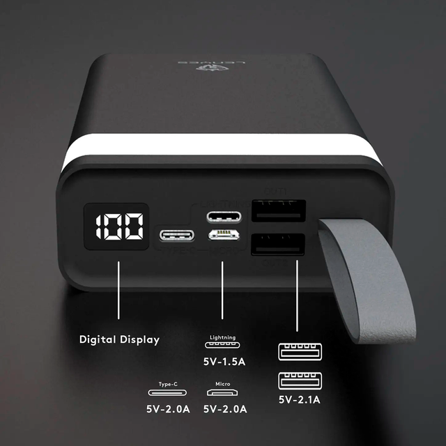 - LED-екран — щоб дізнатися поточний рівень заряду, треба лише натиснути на кнопку. Повербанк одразу ж вираховуватиме кількість енергії, що залишилася, та покаже це на Led-дисплеї;
