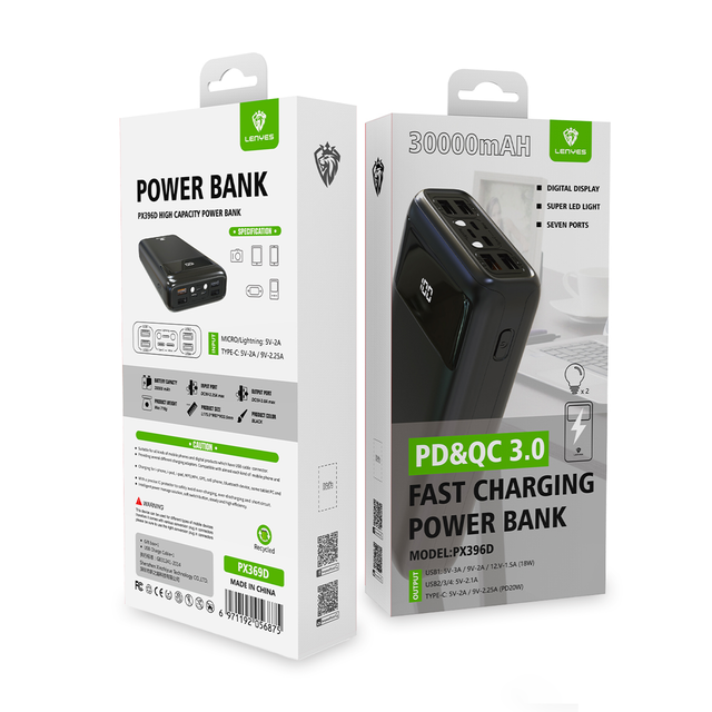 Переносний зарядний пристрій LENYES PX396D — це девайс ємністю 30000 мА/год, створений для тривалого перебування поза джерелами мережевого електропостачання. Пристрій виготовлений із міцних вогнетривких матеріалів. Модель обладнана цифровим індикатором рівня заряду та ліхтариком для зручного користування темної пори. Також зарядний пристрій може похвалитися цілою системою захисту, яка перешкоджає виникненню перенапруги, перевантажень і перегрівів під час використання.