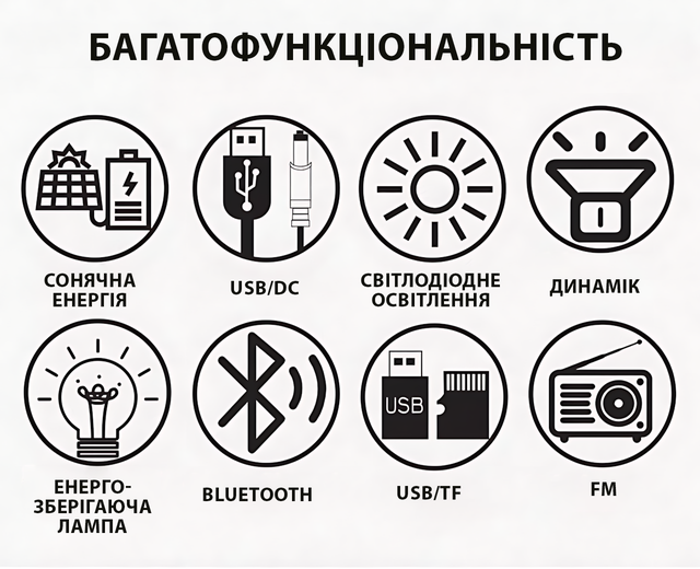 - ✅ Універсальне харчування — працює від акумулятора, мережі або сонячної панелі, що ідеально для використання в будь-яких умовах.
