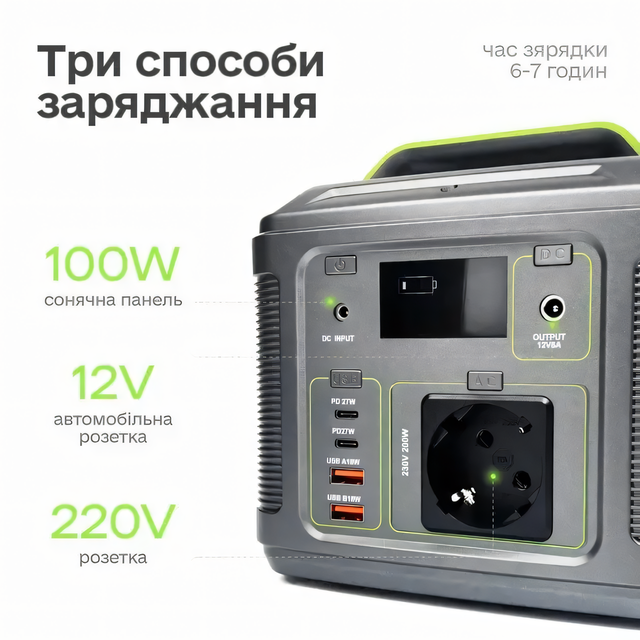 - Способи заряджання: Від адаптера постійного струму 15 В/2 А: час заряджання 6-7 годин. Від автомобільного прикурювача 12 В/2 А: час заряджання 6-7 годин. Від сонячної панелі 12-20 В/5 А: час заряджання 6-7 годин.