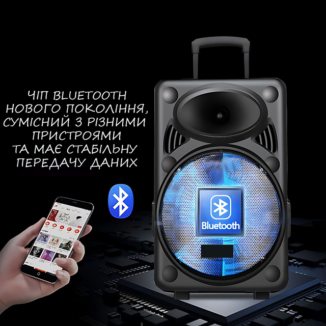 - Підтримка Bluetooth і наявність входів для SD-карт і USB-пристроїв: Колонка обладнана функцією Bluetooth, що дає змогу легко під'єднувати мобільні пристрої без використання дротів. Крім того, є слоти для SD-карт і USB-порт, що дає змогу відтворювати музику безпосередньо з різних носіїв, як-от флешки або карти пам'яті;