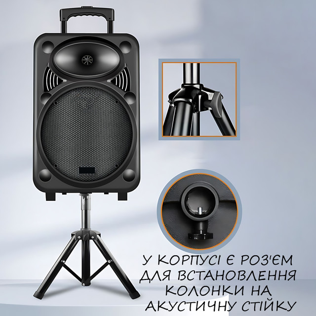 - Можливість встановлення на акустичну стійку: Колонка має спеціальний роз'єм для встановлення на акустичну стійку, що дає змогу підняти її на необхідну висоту для кращого поширення звуку. Це особливо корисно на великих заходах, де потрібно забезпечити рівномірне звучання на всій площі;