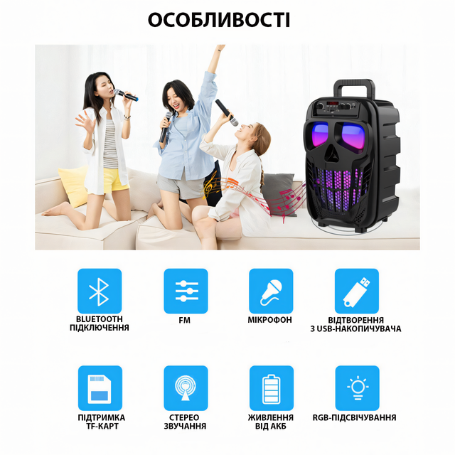 - Функція USB/TF/BT/FM/AUX/MIC/LED;