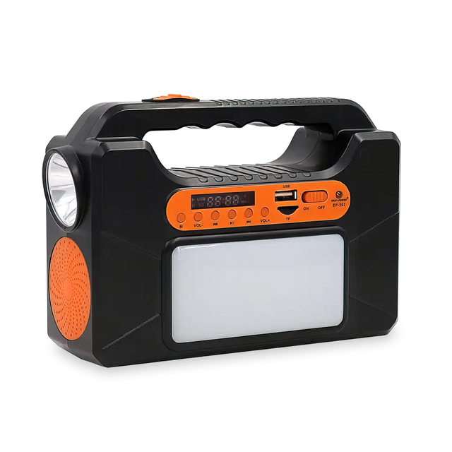 Ліхтар PowerBank EP-393BT з радіо/блютуз — це компактний мінігенератор павербанк із сонячною панеллю, FM радіо та трьома світлодіодними лампами. Він підходить для використання в будь-яких місцях, де доступне сонячне світло. Ліхтар можна заряджати як від мережі змінного струму, так і від сонячної панелі. З usb-кабелем для заряджання ви зможете заряджати мобільні пристрої й інші електронні прилади через вбудований акумулятор. Він має багаторазову можливість заряджання сонячною енергією, що робить його екологічно чистим і енергоощадним. До комплекту входять 3 світлодіодні лампи з низьким енергоспоживанням, які ідеально підходять для внутрішнього та зовнішнього освітлення, кемпінгу та інших ситуацій. Ви зможете використовувати вбудований акумулятор великої ємності для заряджання мобільних телефонів, MP3-плеєрів, камер та інших пристроїв. Ліхтар також обладнаний світлодіодним світильником із низьким енергоспоживанням і високою яскравістю, забезпечуючи стабільне та якісне освітлення. Його функція радіо додає додаткової універсальності у використанні.