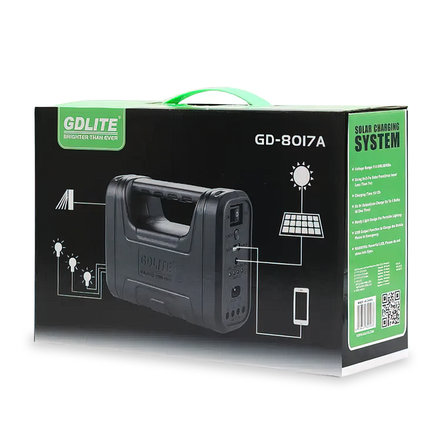 GD Lite GD-8017A — ідеальне рішення у разі вимкнення електроенергії або браку стаціонарних джерел живлення. З цим пристроєм ви зможете зарядити свій телефон або планшет, а також забезпечити яскраве освітлення завдяки світлодіодним лампам, які постачаються в комплекті. Яскравість лампочок достатня для різних завдань, чи то читання, чи то приготування їжі. Акумулятор системи GD Lite GD-8017А можна зарядити двома способами: через мережу 220 В (займет 13 годин) або за допомогою сонячної батареї (12 годин). У наборі також передбачено 10 різних роз'ємів для заряджання телефонів та інших пристроїв. Використання цієї системи просто й інтуїтивно зрозуміле, а зручний і міцний корпус забезпечує надійний захист пристрою від пошкоджень. Будьте завжди під'єднані та майте доступ до світла з GD Lite GD-8017A!