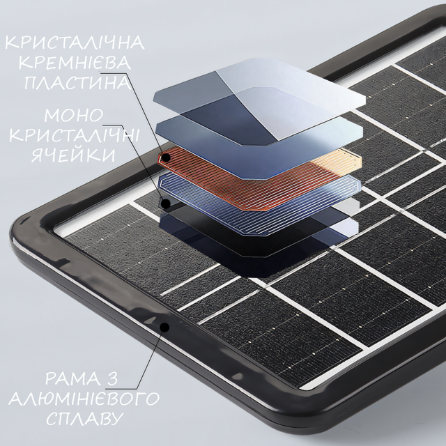 - Сонячна панель: 6 V3.8W монокристалічний кремнієвий елемент;