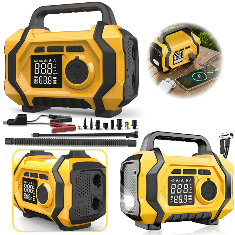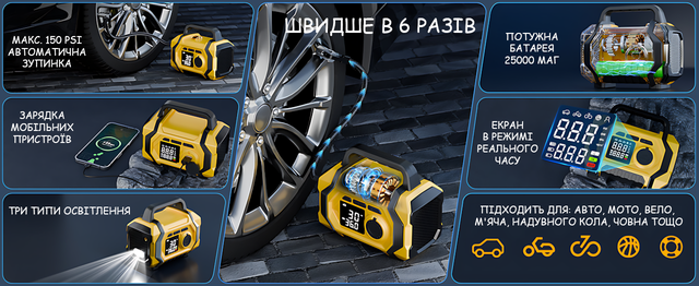 Портативний компресор-насос ATJ-201 (Жовтий, 150 PSI, 25000 мА·год, Type-C 5V/1A) — Бездротовий мінікомпресор 4-в-1 з ліхтариком і USB, для авто, мото, велосипеда та м'ячів