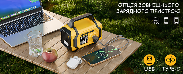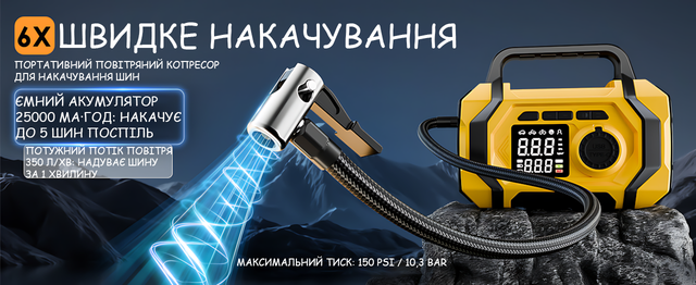 - 🔋 Ємний акумулятор 25000 мА·год: накачує до 5 шин поспіль