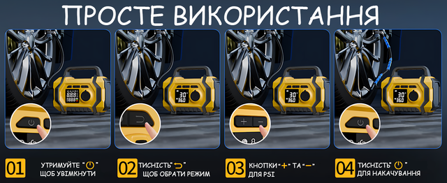 - 💨 Потужний потік повітря 350 л/хв: надуває шину за 1 хвилину