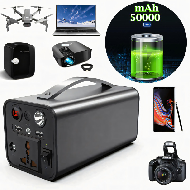 Це не просто зовнішній акумулятор, а потужна переносна зарядна станція, здатна заряджати і живити практично будь-які мобільні пристрої та деякі побутові прилади зі споживаною потужністю до 200 Вт-год. Для зарядки мобільних пристроїв передбачено два USB-порти, включно з USB QC3.0. Для побутових приладів акумулятор оснащений розеткою на 220 Вольт і портом для 12-вольтових пристроїв (DC 12V). Це дає змогу заряджати і використовувати різну техніку: телефони, планшети, вентилятори, телевізори, ноутбуки, комп'ютери, освітлення та багато іншого. Як накопичувач енергії використовуються літій-іонні акумуляторні елементи загальною ємністю 50000 мА-год, термін служби яких становить 700 циклів без зниження ємності. Зарядна станція видає чисту синусоїду на виході, що забезпечує безпеку пристроїв, які підключаються. Вона оснащена LED-дисплеєм, що показує рівень заряду, і світлодіодною лампою потужністю 3 Вт із трьома режимами роботи. Пристрій можна заряджати за допомогою кабелю від мережі 220 В (входить до комплекту) або сонячної панелі з роз'ємом DC 15V.