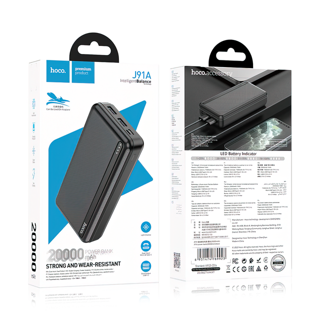 Портативний зарядний пристрій HOCO J91A з ємністю 20000 мА/год призначений для продовження часу автономної роботи ваших пристроїв. Виготовлене в компактному форм-факторі з якісних матеріалів, воно легко поміщається в кишені. Для заряджання мобільних пристроїв доступні USB-виходи. Батарея підтримує заряджання з напругою 5 В і силою струму 2.1 А. Завдяки індикатору заряду ви завжди будете в курсі залишкової потужності акумулятора, уникаючи несподіваних розряджень. Незамінний супутник у подорожах і на повсякденних справах, HOCO J91A забезпечить вашу електроніку енергією за будь-яких обставин.