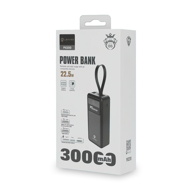 Power bank LENYES PX321D — це не просто портативний зарядний пристрій, а компактний супутник для тих, хто цінує мобільність. З його ємністю на 30000 мА/год ви можете бути впевнені, що ваші ґаджети завжди будуть на підході. Дизайн моделі не тільки функціональний, але й приємний у тактильному сенсі завдяки текстурованій поверхні, яка робить використання цього аксесуара ще комфортнішим.