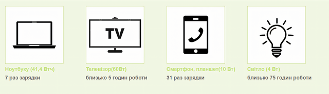 Ця зарядна станція універсальна та здатна забезпечувати запасні ґаджети та пристрої, що підтримують USB-під'єднання, а також прилади, що вимагають прямого увімкнення в мережу 220 В. Мобільні телефони, планшети, фото- та відеокамери, освітлювальні прилади, ноутбуки — все це можна легко заряджати або підтримувати роботу завдяки універсальному порту.