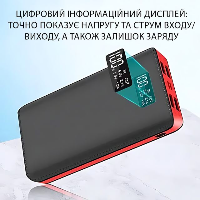 Корпус зроблений із міцного пластику, який не боїться повсякденного життя. Замість вгадування за миготливими лампочками — LCD-дисплей із відсотками, щоб ви точно знали, скільки енергії залишилося і чи варто брати кабель «про всяк випадок».