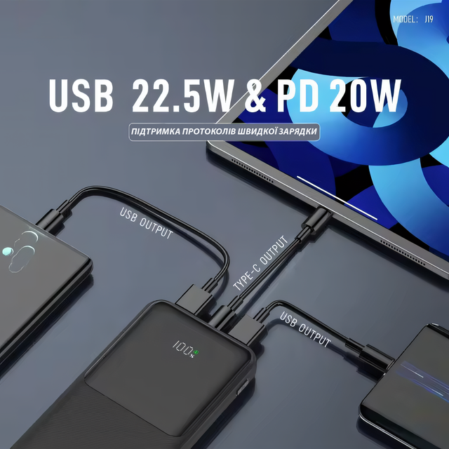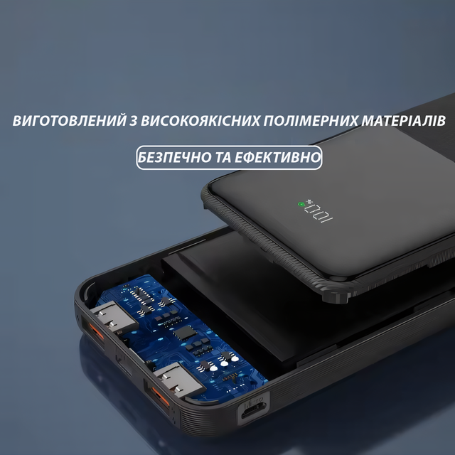 - Висока ємність: 20000 mAh дає змогу багаторазово заряджати пристрої, забезпечуючи тривале використання без потреби частого підзаряджання;