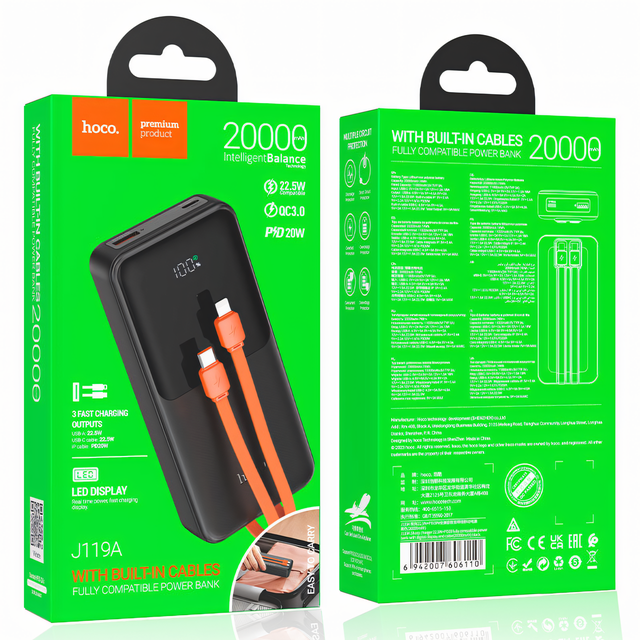 Power bank HOCO J119A Sharp charger з місткістю 20000 mAh і потужністю 22.5W є надійним і універсальним портативним зарядним пристроєм. Він обладнаний входом Type-C, портом USB-A, а також вбудованими кабелями для виходів Lightning і Type-C. Цифровий LED-дисплей показує рівень заряду, а зелений індикатор вказує на використання швидкої зарядки PD і QC. Підтримка безлічі протоколів швидкого заряджання робить його ідеальним для швидкого й ефективного поповнення енергії ваших пристроїв.