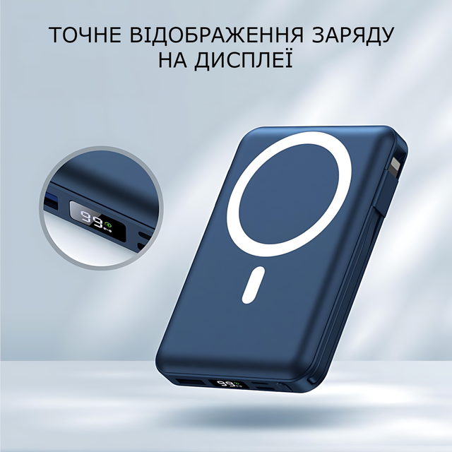 Power Bank Yiisonger KT-D011 10000 mAh, 22.5 Вт, магнітна, бездротова зарядка 15 Вт, вбудовані кабелі, цифровий дисплей, тонкий, синій