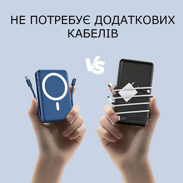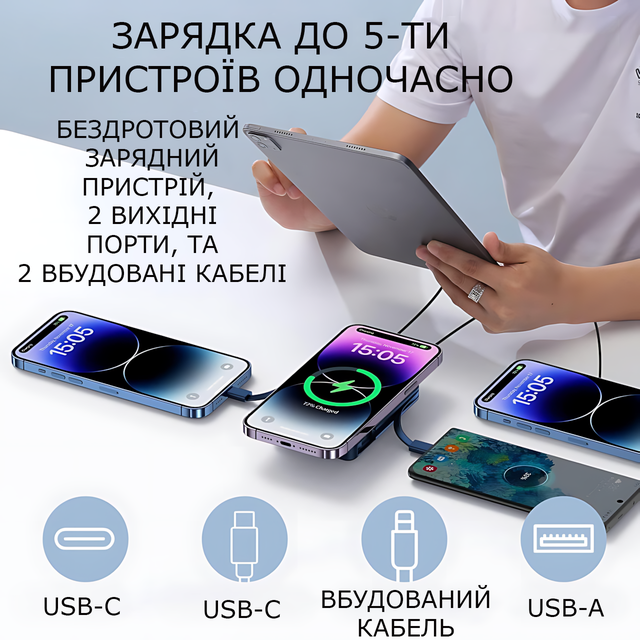 Завдяки вбудованим кабелям, юзб-порту та бездротовій зарядці power bank здатний заряджати до 5 пристроїв одночасно. Підходить для iPhone (включно з 12-15 лінійками), AirPods, андроїд-пристроїв, smart-годинником + ґаджетів із бездротовою зарядкою.