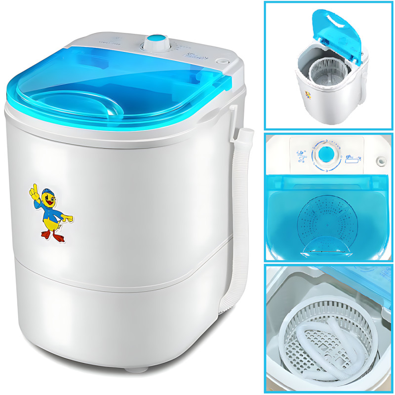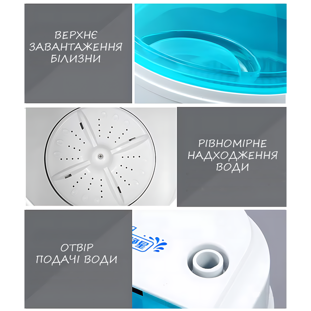 Міні пральна машина — це компактне та зручне рішення для невеликих приміщень. З верхнім завантаженням і механічним керуванням вона проста у використанні та підходить для малих сімей або одиничних користувачів. Потужність 260 Вт забезпечує ефективне прання із завантаженням до 4,5 кг білизни. Матеріали корпусу з ABS і PP гарантують довговічність і захист від вологи з водонепроникним рейтингом IPX4. Пристрій займає мало місця завдяки своїм компактним розмірам (330х330х450 мм). Метод вниз-слива спрощує процес видалення води. Міні пральна машина важить лише приблизно 5 кг, що робить її легкою та мобільною. Стандартна напруга 220 В/50 Гц робить її сумісною з більшістю побутових мереж.
