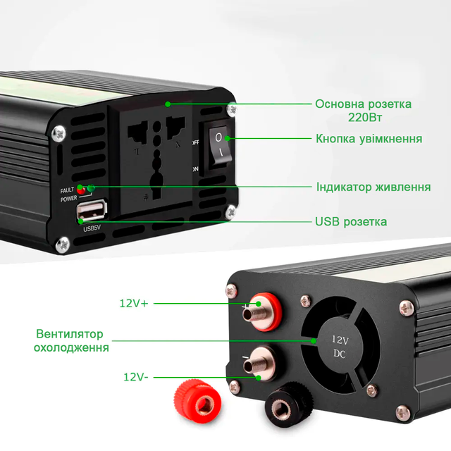 Для охолодження перетворювача використовується вбудований малошумний вентилятор, що включається автоматично за потреби.