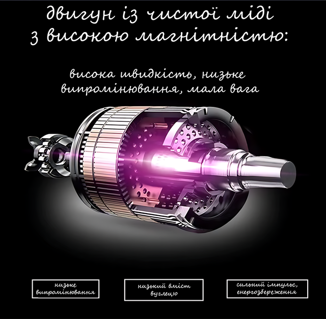 Він потужний — 2000 Вт! Але не безжальний. Сушить швидко-ощадно. А іонна функція творить чудеса. Усуває статику. Робить волосся гладким, слухняним і з дзеркальним блиском.