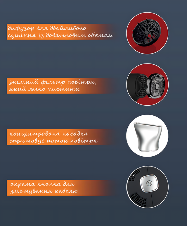 - Швидке сушіння завдяки потужності 2000 Вт.