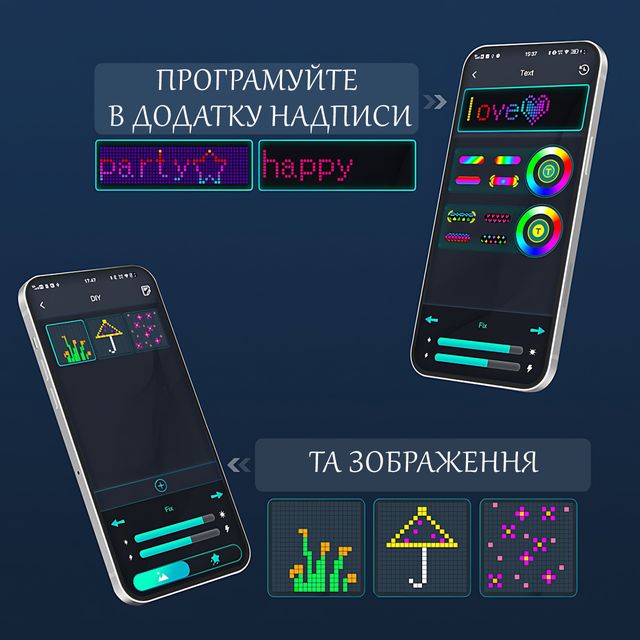 - Програмовані написи та зображення: Можливість створювати персоналізовані світлові ефекти, включно з текстовими повідомленнями та простими зображеннями;