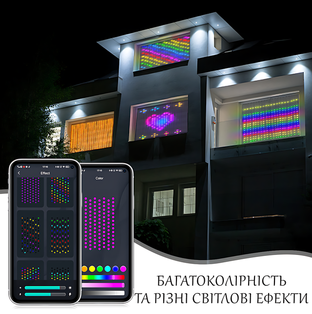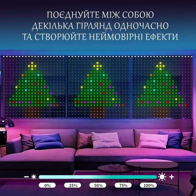 - RGB-подсветка: Гірлянда забезпечує багатосвітове світіння, створюючи ефектні світлові сценарії;