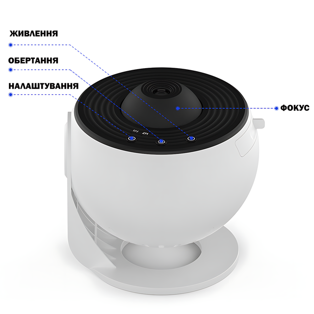 - Обертання на 360°: Легко регульована проєкція для стелі, стін і підлоги;
