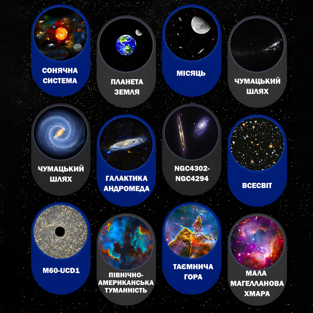 - 12 космічних сценаріїв: Спостерігайте за Сонячною системою, Чумацьким шляхом, Місяцем, Галактикою Андромеди та іншими чарівними небесними об'єктами;
