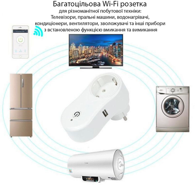 Wi-Fi розетка з USB — це розумний пристрій, який можна інтегрувати у ваш "розумний дім". Це дає змогу вам керувати своїми електричними приладами та освітленням віддалено через вбудований Wi-Fi модуль. Ви можете контролювати розетку в будь-який час і в будь-якому місці, головне — мати доступ в інтернет. Розетка призначена для керування побутовими приладами, що працюють від 100 до 240 вольтів (як-от вентилятори, гірлянди, водонагрівачі, чайники, телевізори, зволожувачі та інші), з максимальною потужністю до 16 амперів.