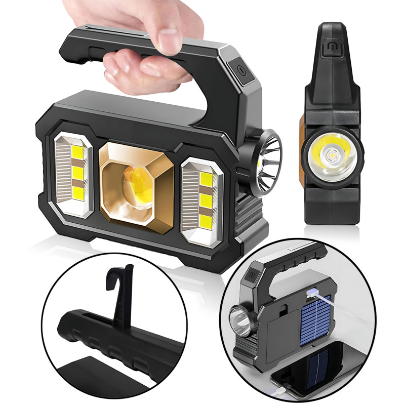 Ручний акумуляторний ліхтар TORCH KJ-208T із сонячною панеллю, 6 режимів, COB+SMD LED, Power Bank, дальність 300 м, USB і батарейки AA/18650, портативний для кемпінгу, дому та аварійних ситуацій