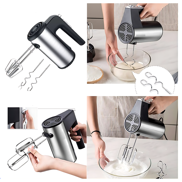 - Насадки в комплекті: 2 віночки для збивання, 2 гаки для замішування тіста;