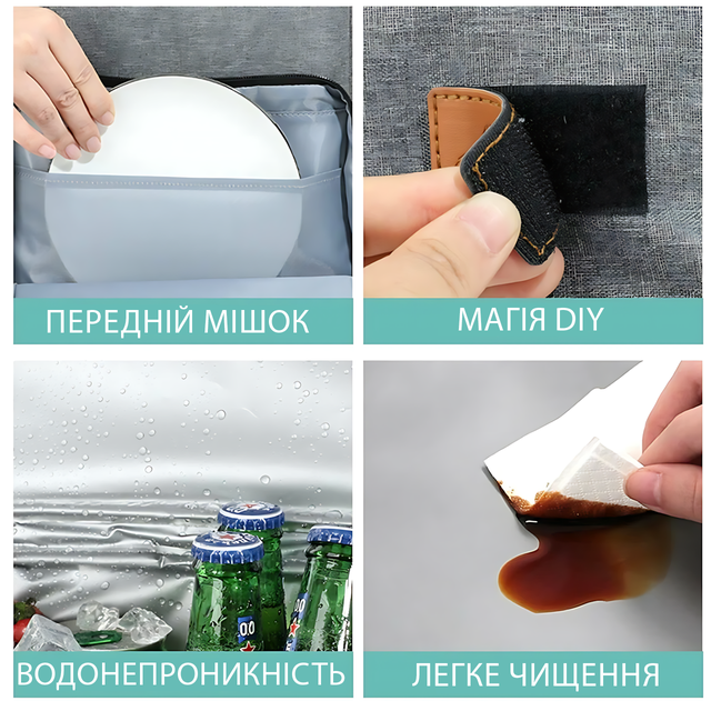 - ???? Внутрішня PEVA-підкладка — не пропускає воду, не тримає запахи, миється серветкою. Один помах — і знову чисто.