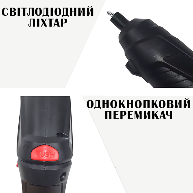 - Універсальний набір насадок: До комплекту входять насадки для роботи з різними типами гвинтів і болтів, що робить шурупокрут багатофункціональним помічником у будь-якому проєкті;