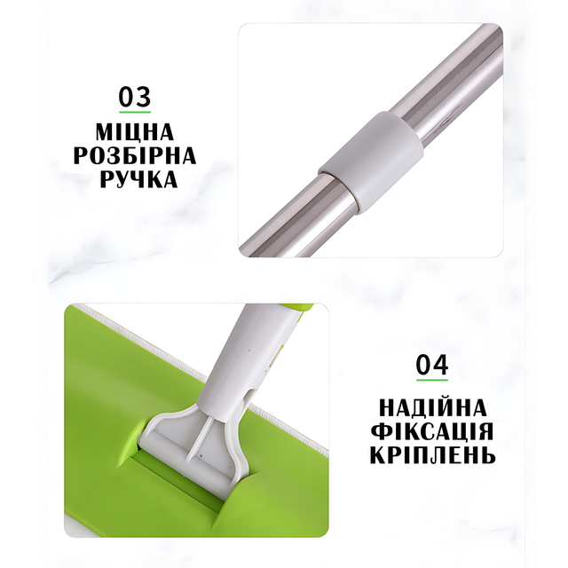 - Матеріал: Мікрофіброва насадка, що ідеально збирає пил і бруд.