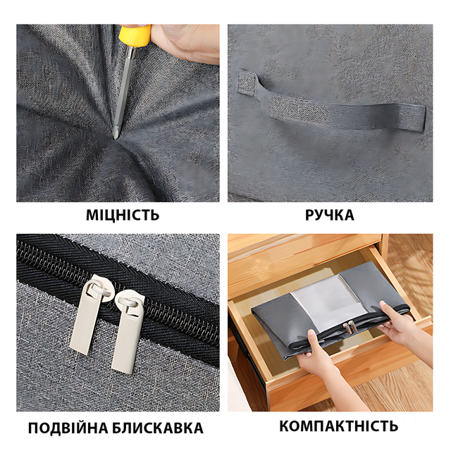 Хочете, щоб речі завжди були акуратно складені та захищені від пилу? Ця сумка-кофр — ваш вірний помічник в організації простору! Підходить для білизни, одягу, постільного приладдя, іграшок і навіть сезонних речей. Майже дріб'язок, а наскільки зручно!