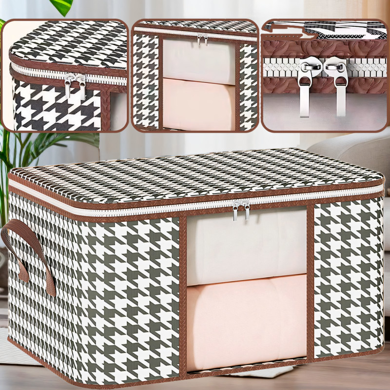 Прямокутна форма кофра легко поміщається на будь-якій полиці, а надійна блискавка не дасть вашим речам випасти. Крім того, його стильний дизайн і чорний колір із візерунком "Гусяча лапка" зроблять його не тільки практичним, але і стильним елементом вашого інтер'єру.