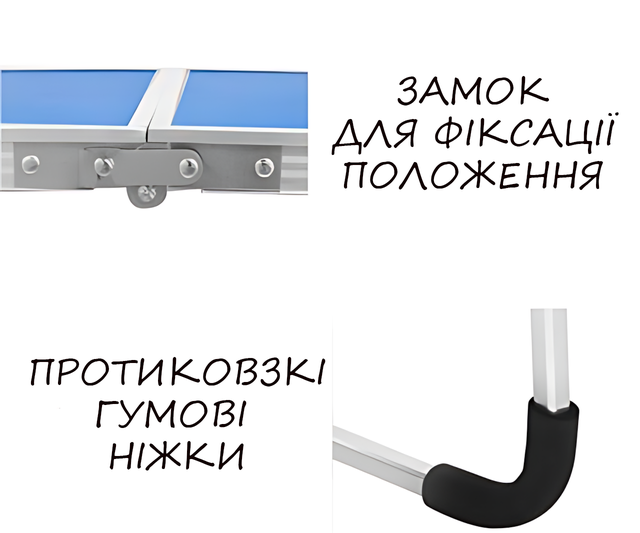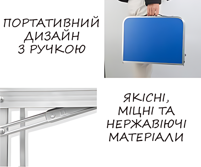 - Портативність: Легко складається й має ручку для перенесення, що робить стіл зручним у транспортуванні;