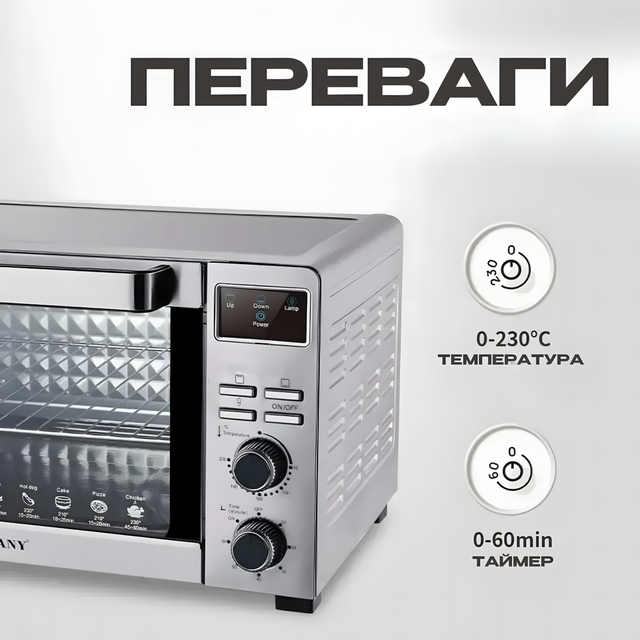 - 3 режими нагрівання — верхній, нижній і комбінований