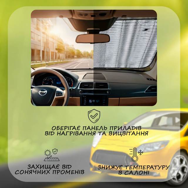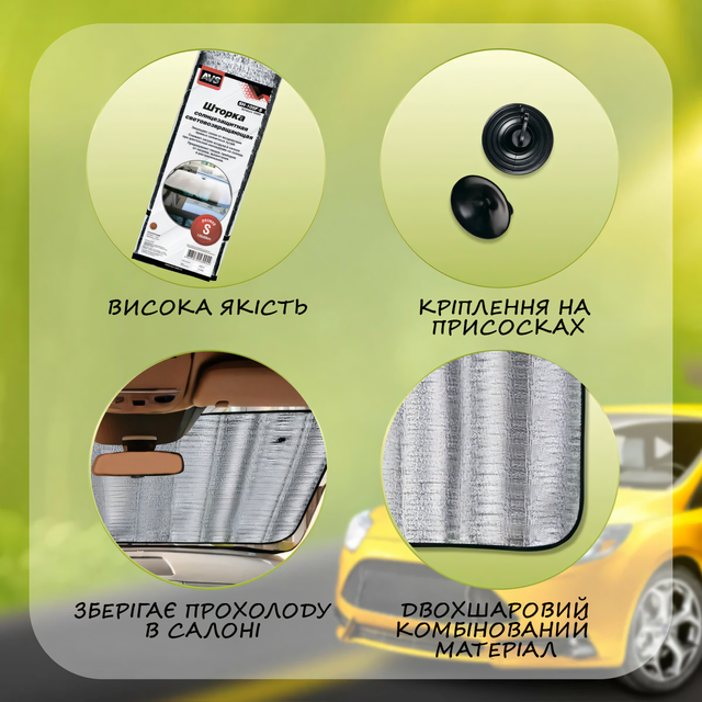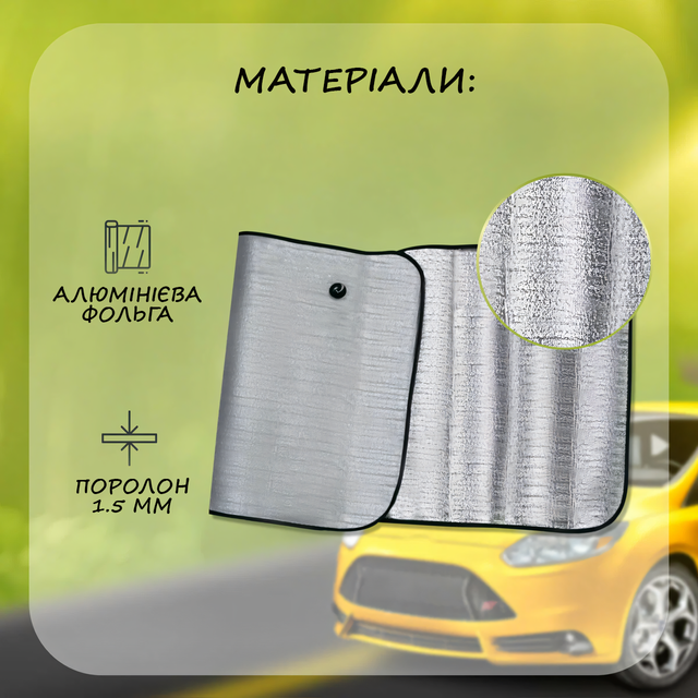 Сонцезахисна шторка для лобового скла автомобіля являє собою комбінований виріб, що складається з двох шарів: алюмінієвої фольги та поролону завтовшки 1,5 мм. Вона призначена для встановлення на лобове скло за допомогою двох присосків, що входять до комплекту. Сонцезахисна штора не тільки захищає салон від ультрафіолету, але й допомагає блякненню приладової панелі та шкіри салону, ефективно стримуючи прямі сонячні промені.