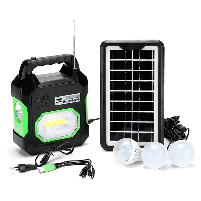 Сонячна система GD 15 — це набір із високоякісних ліхтарів із радіо, mp3-плеєром, виносною сонячною панеллю й можливістю заряджати свої ґаджети. Пристрій чудово підходить для використання під час вимкнень електроенергії, дає змогу створити автономне освітлення й бути завжди на зв'язку. Ємність акумулятора становить 9000 мА/год, чого цілком досить для забезпечення від 7 до 18 годин освітлення, залежно від кількості використовуваних джерел світла. Час повного заряджання від сонячної панелі становить 10 годин, а від мережі лише 6 годин. Про залишку заряду батареї Ви завжди будете вчасно проінформовані завдяки світловим індикаторам із поділками по 25% кожен.