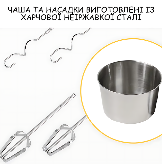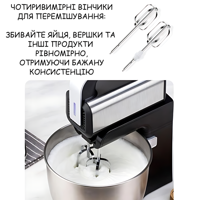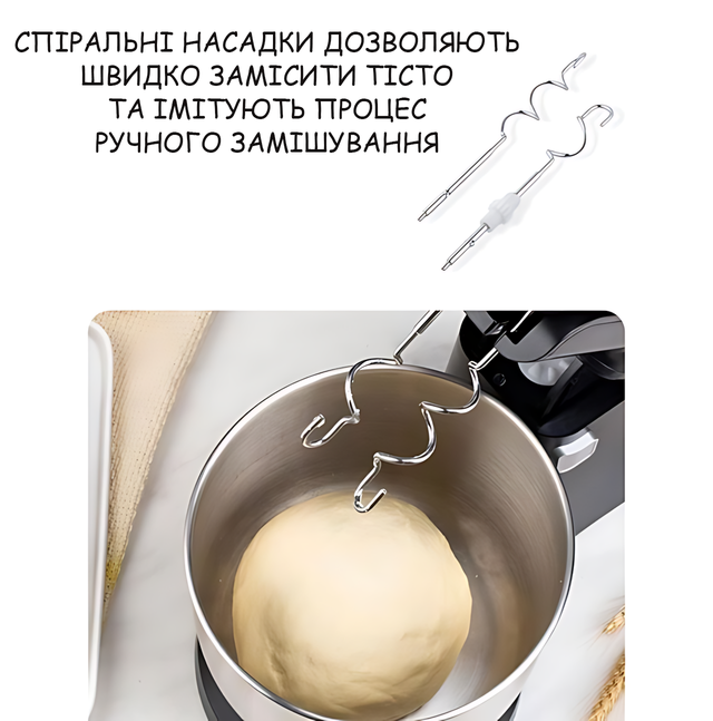 - ✅ Насадки в комплекті — гаки для тіста та віночки