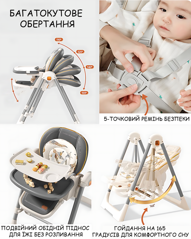 - Тип: стільчик для годування + шезлонг + гойдалка 3-в-1;