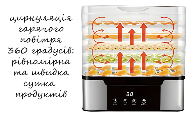 Моторчик на 1000 Вт працює швидко та рівномірно, а вентилятор жене тепло по всіх рівнях так, що вітаміни й аромат залишаються всередині продуктів, а не злітаються в повітря.