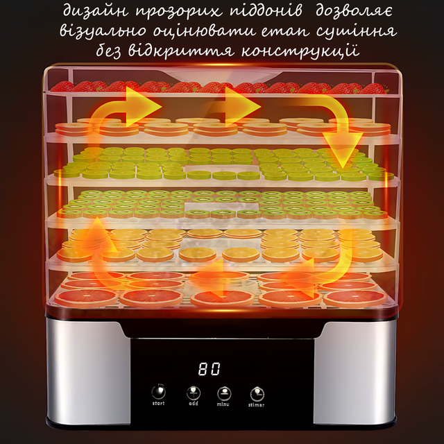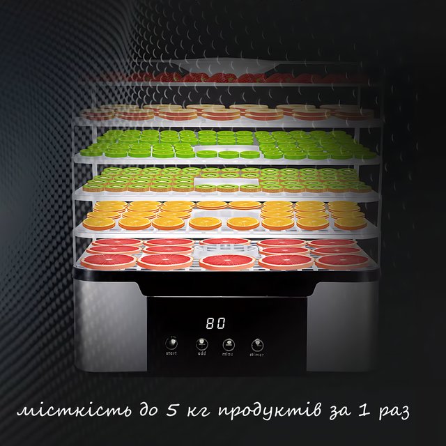 П'ять прозорих піддонів заввишки 4 см — як маленькі сценки, де кожен шматочок фруктів або грибів виступає в головній ролі. І так, на кожному рівні можна сушити по кілограму — у сумі виходить аж 5 кг смаколиків за раз!