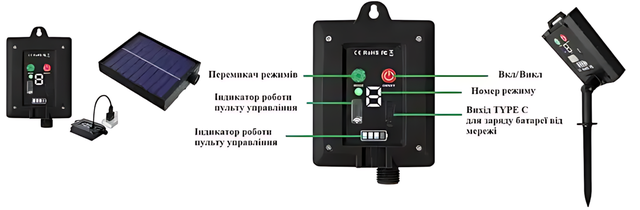 - Джерело живлення: Сонячна панель з акумулятором 1200 mAh;