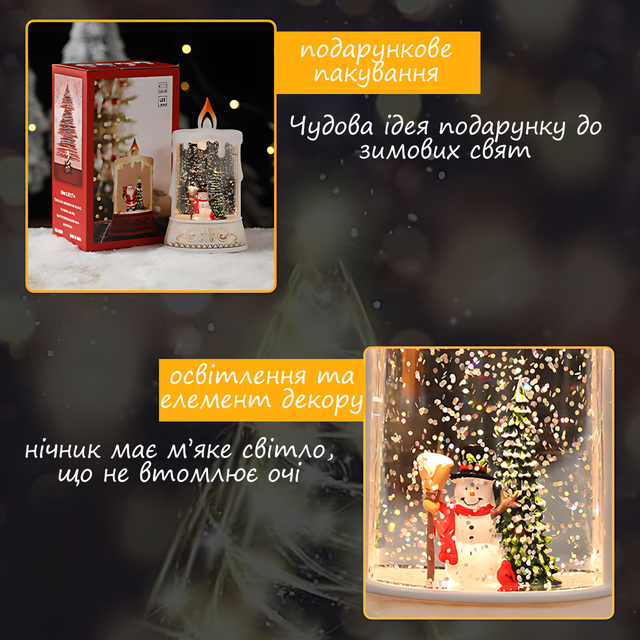 Святковий нічник WDL 23005C XMAS, з фігуркою сніговика, ялинкою, з імітацією снігової хуртовини, робота від 2-х АА