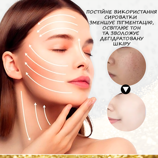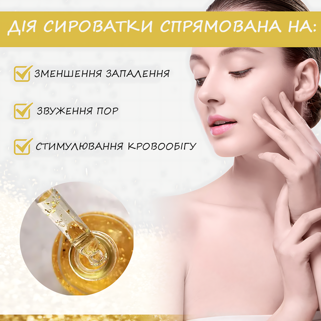 Ця сироватка поєднує в собі розкіш золота та міць природних компонентів для омолодження і глибокого зволоження шкіри. Золоті пластівці надають шкірі сяйва та здорового кольору, гіалуронова кислота забезпечує інтенсивне зволоження, а рослинні екстракти сприяють пом'якшенню й регенерації шкіри. Сироватка допомагає боротися з ознаками старіння, надаючи обличчю свіжості та пружності.