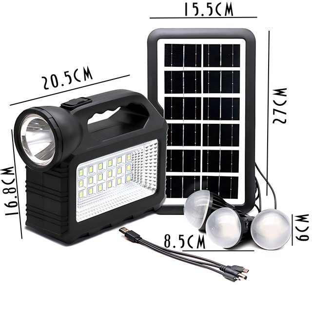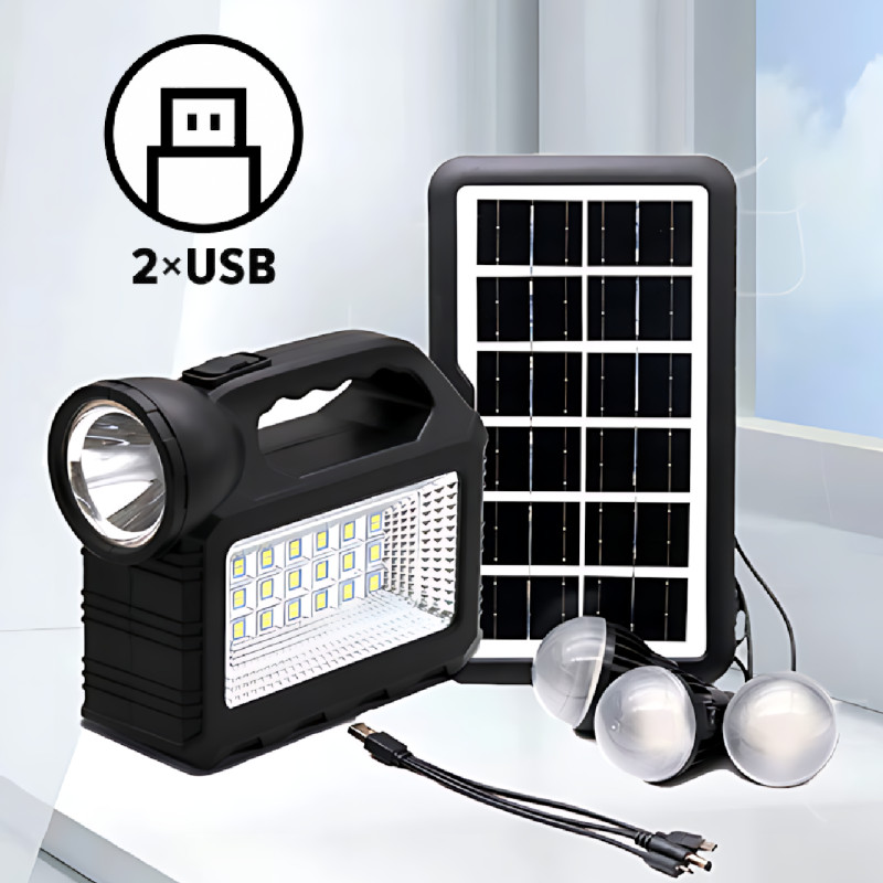 Система GDTimes GD 101 — це компактне й ефективне рішення для автономного освітлення та заряджання, яке ідеально підходить як для використання в екстремальних умовах, так і для забезпечення енергії в разі вимкнення електрики. Сонячна панель потужністю 4 Вт, світлодіодний ліхтар і три лампи створять комфортне освітлення, хай де ви будете. Завдяки універсальному кабелю USB можна заряджати мобільні пристрої, забезпечуючи можливість залишатися на зв'язку навіть за умов відсутності електромережі.